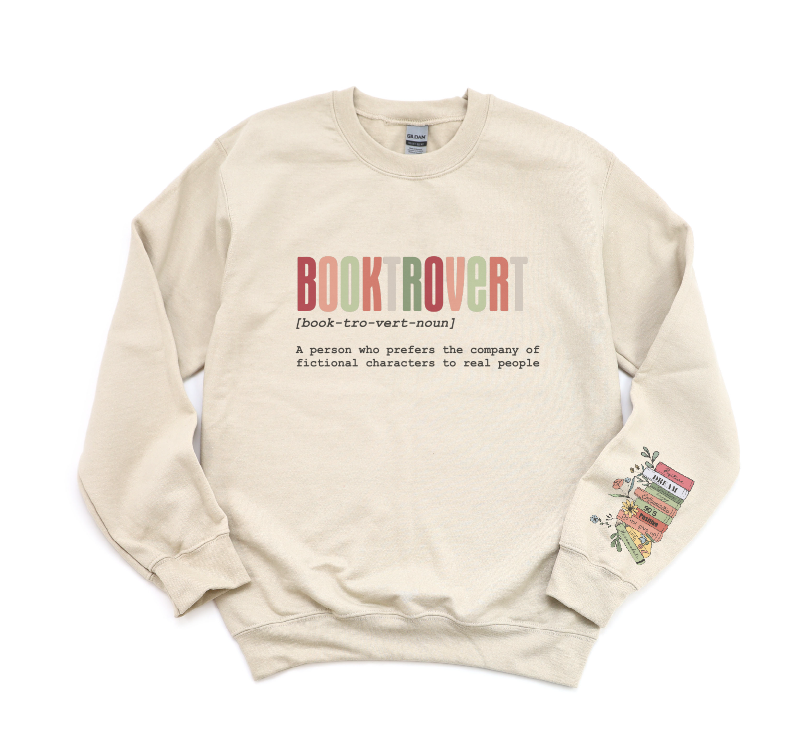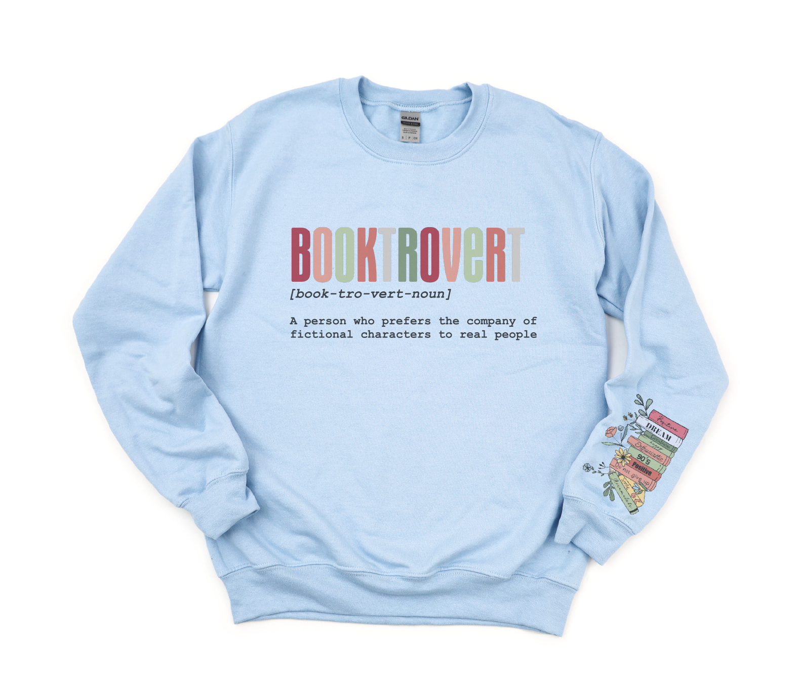 Introducing our Bright Single Print Booktrovert Gildan Sweatshirt with Sleeve Print, perfect for women who prefer the company of fictional characters. Made with a comfortable 50/50 poly cotton blend material, this sweatshirt is perfect for all seasons and casual occasions. And you can choose from one of four different colors.